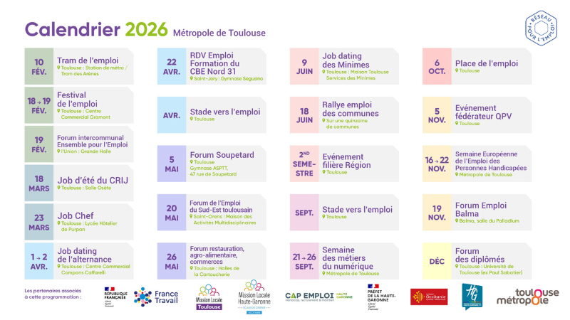 En ce début d’année nous sommes heureux de vous partager la frise des événements emploi 2026 élaborée avec le Réseau Pour l’Emploi de la Métropole de Toulouse composé de France Travail, Toulouse Métropole, des Missions locales de Toulouse et Haute-Garonne, de Cap emploi de la Préfecture Haute-Garonne, de la Région Occitanie et du Département de la Haute-Garonne. Une année riche en rendez-vous, construite de manière concertée avec les acteurs de l’emploi, afin de mutualiser les actions d’éviter les chevauchements et d’offrir une vision claire des initiatives organisées sur notre territoire en matière de rencontres emploi.